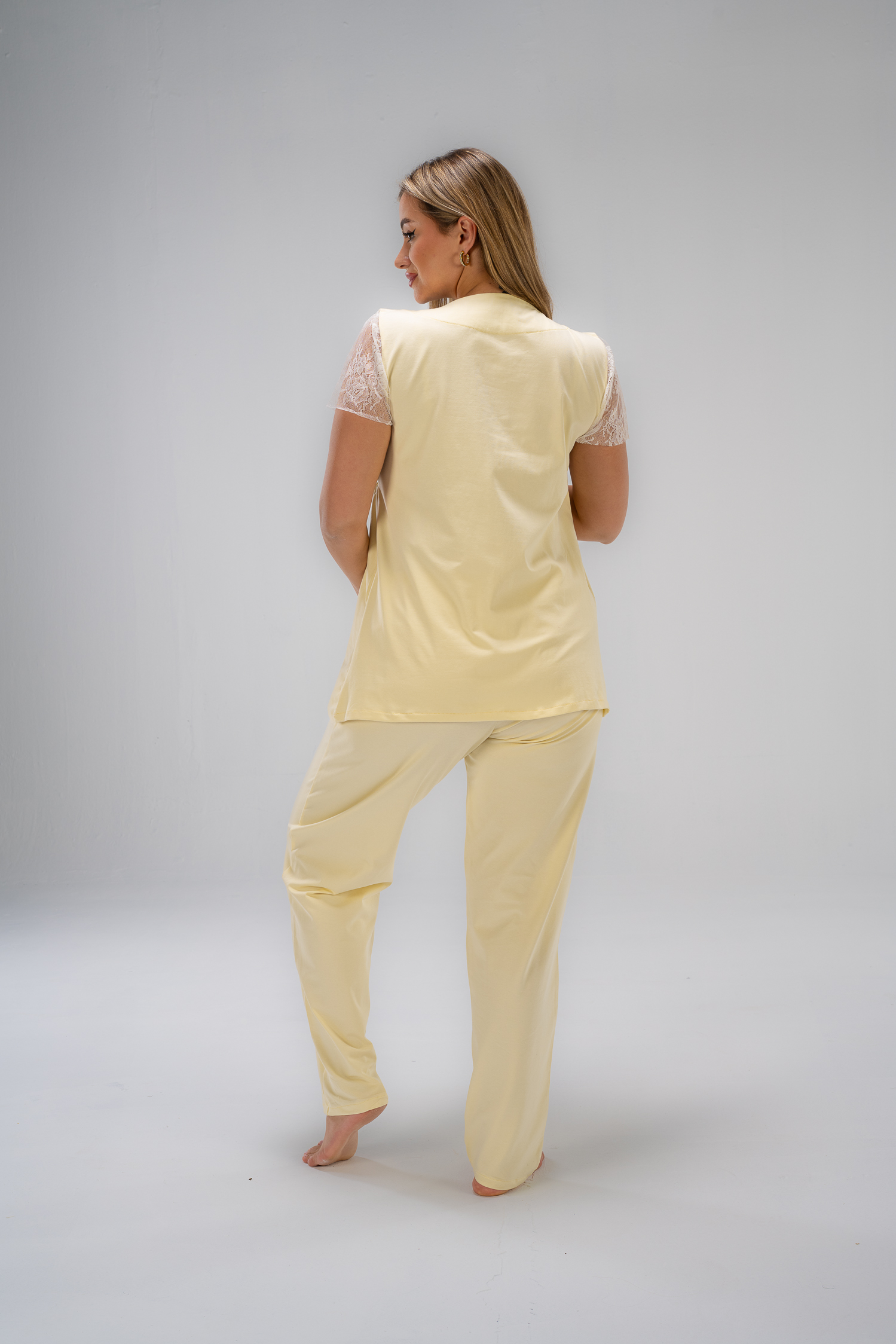 بيجاما قطنية صيفي توفر أعلى درجات الراحة خلال فترة حملك. مصممة لتناسب جسمك المتغير بوجود استيك بنطالون قابل للتعديل مع نمو البطن و أيضا بها تفصيلة أزرار تسهل عملية الرضاعة ، هذه البيجاما تضمن لك شعوراً بالراحة والأناقة في جميع الأوقات