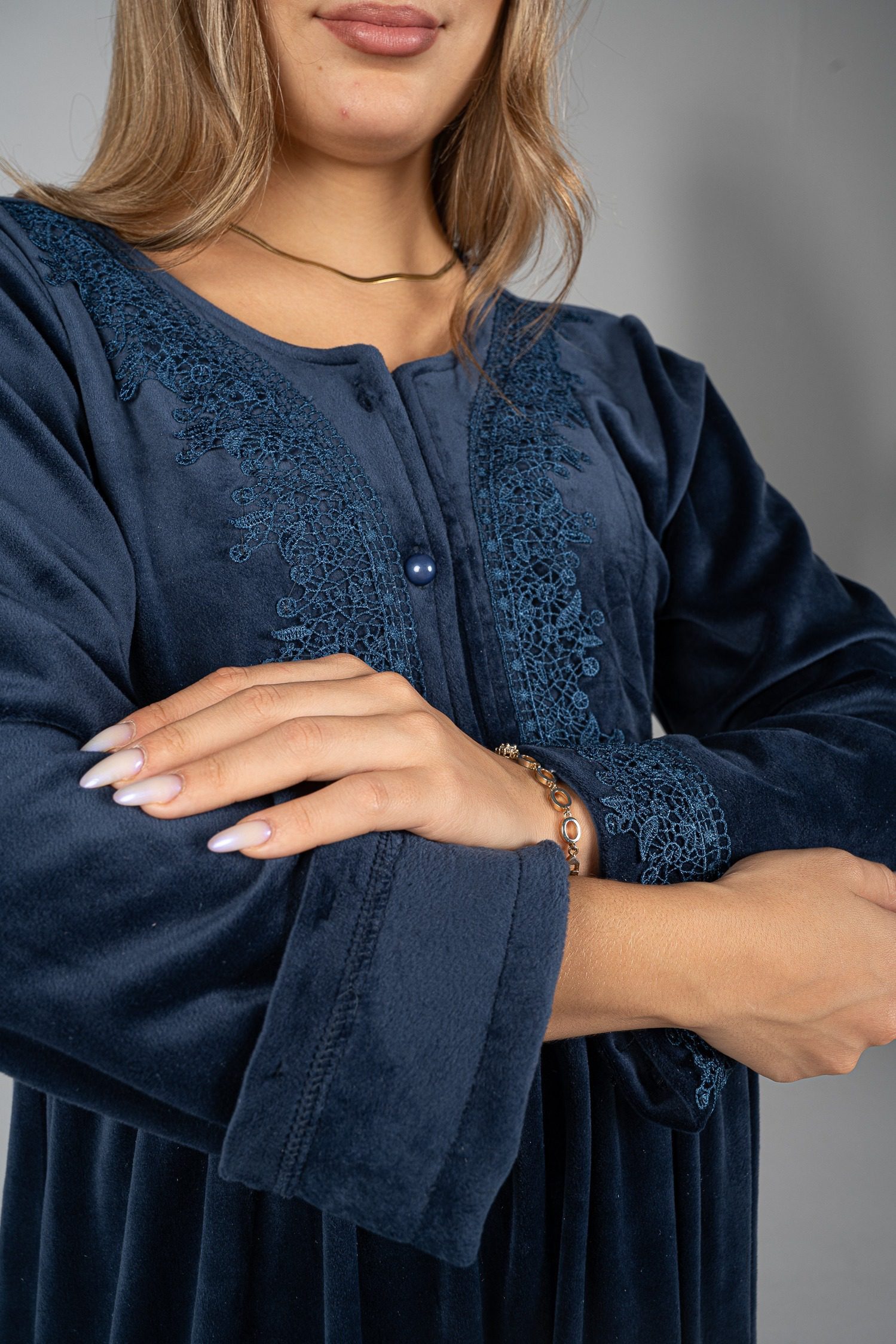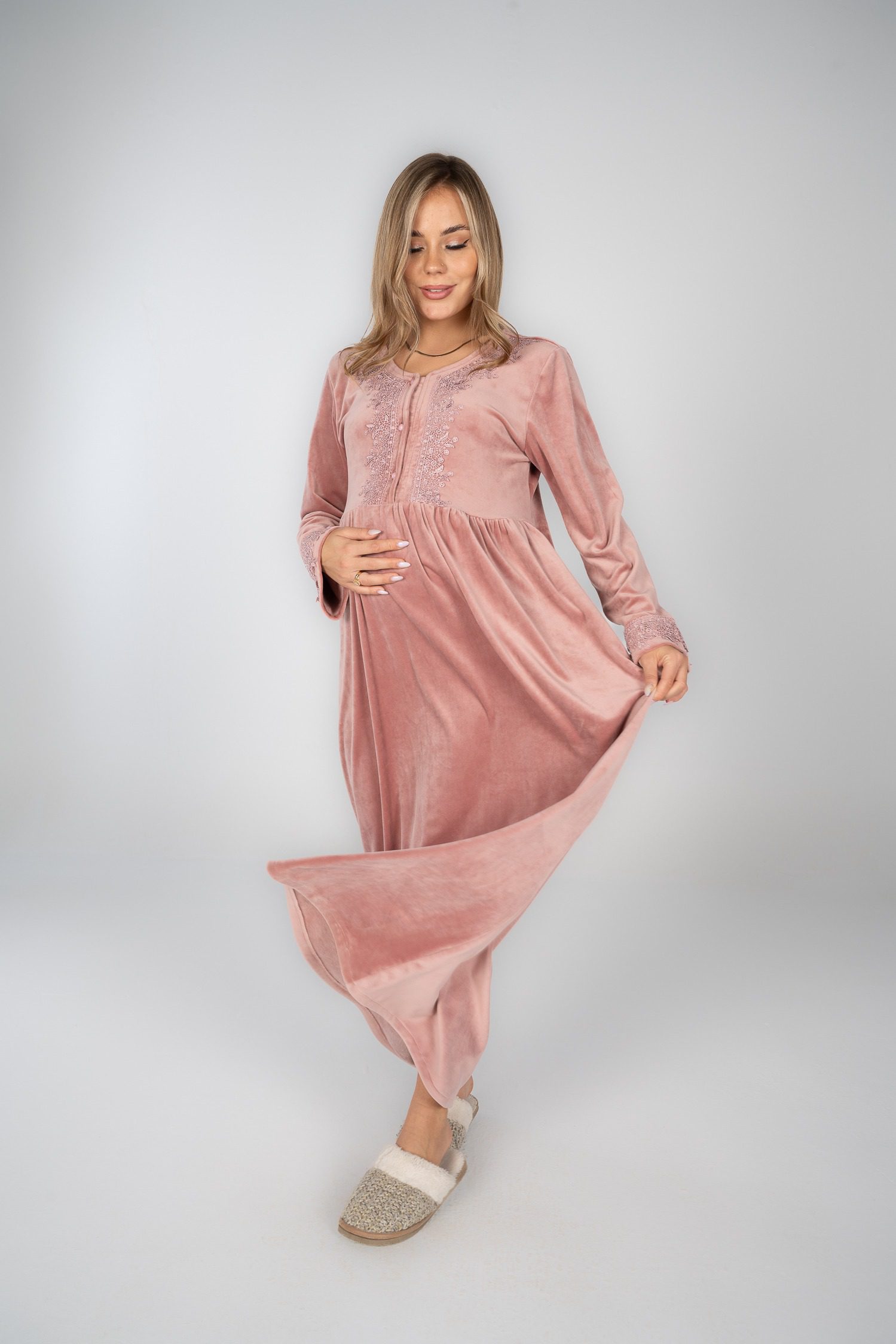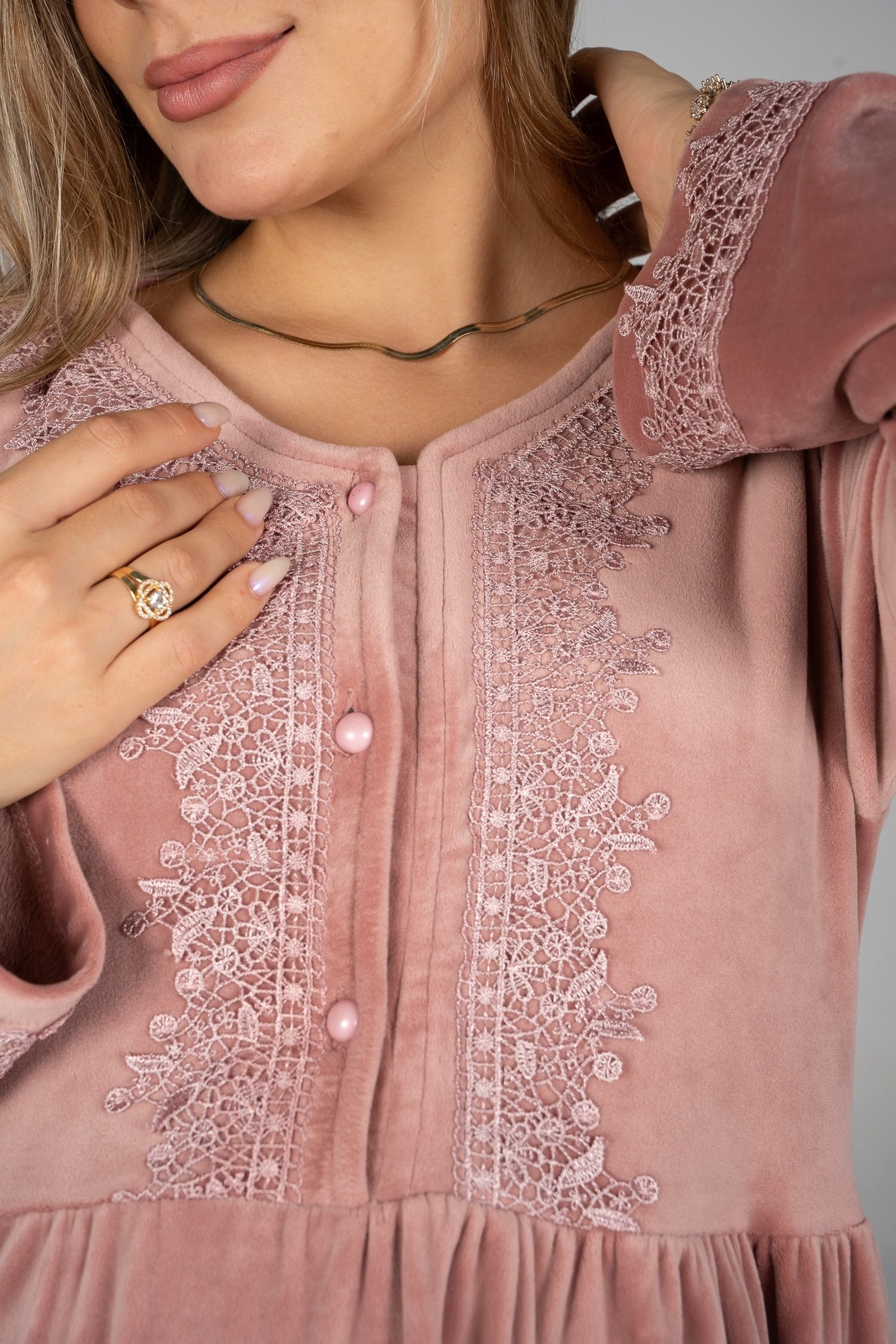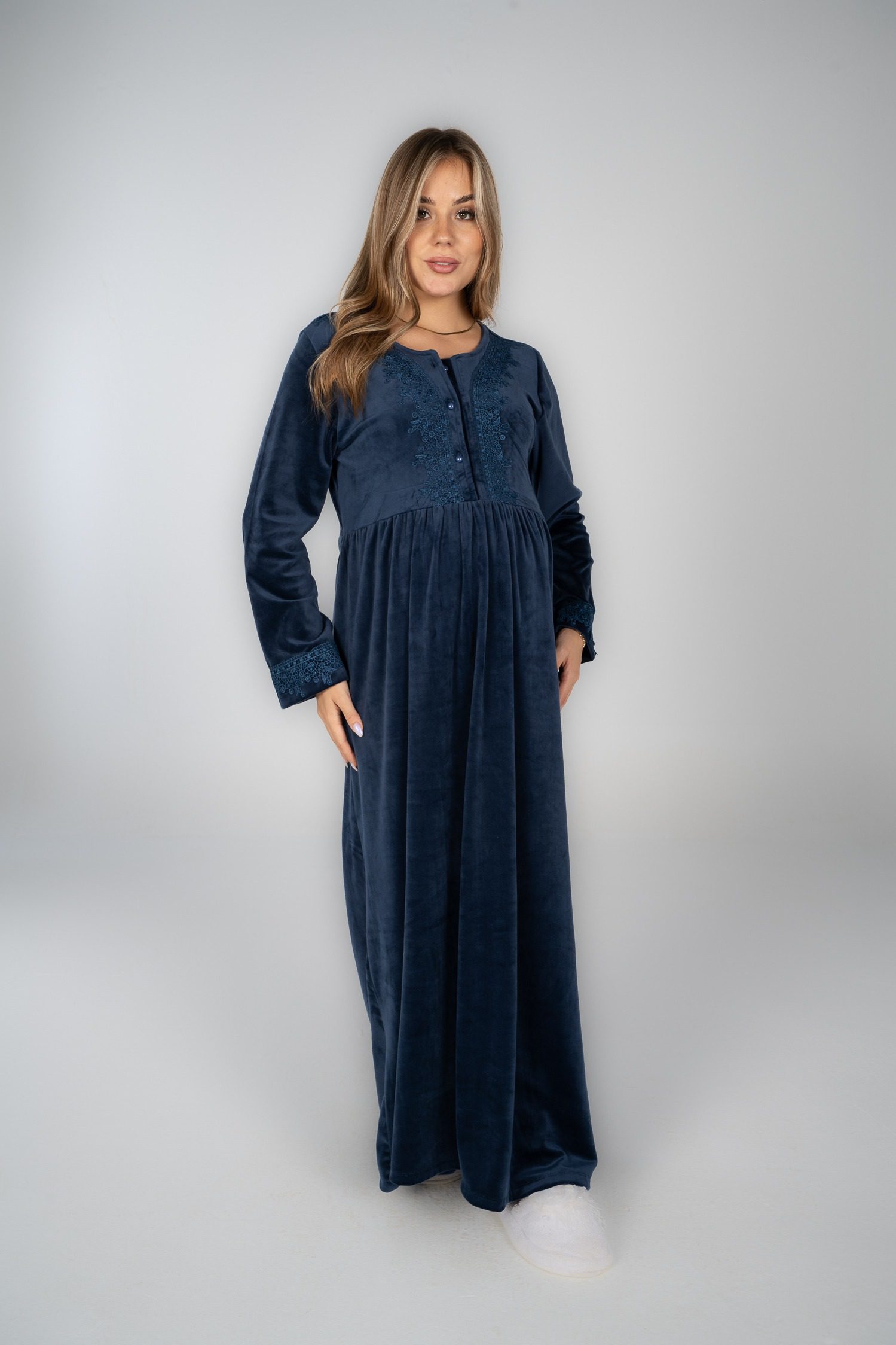 قميص نوم شتوي مخملي مع تفاصيل من الدانتيل لإضفاء لمسة أنيقة.