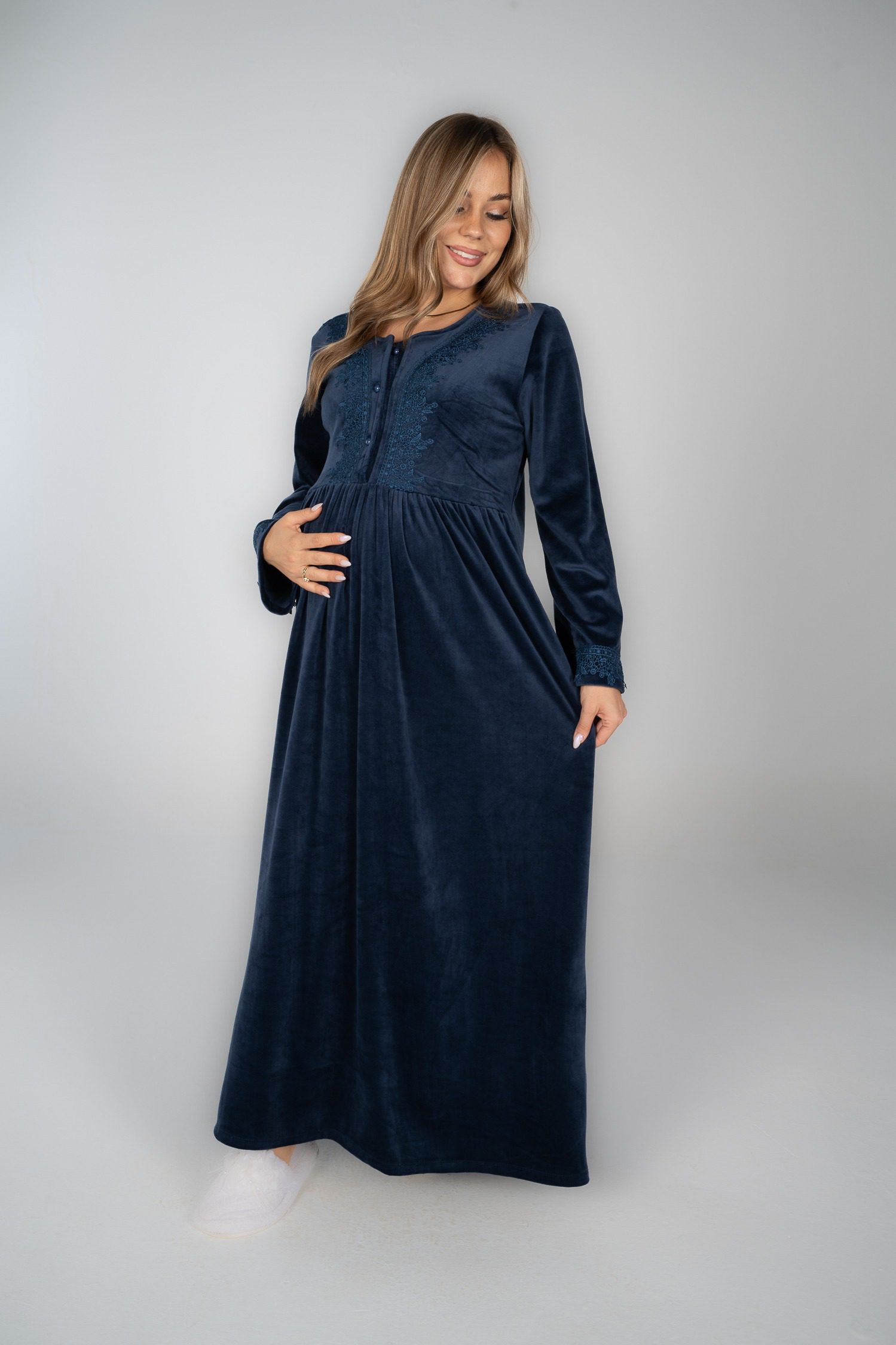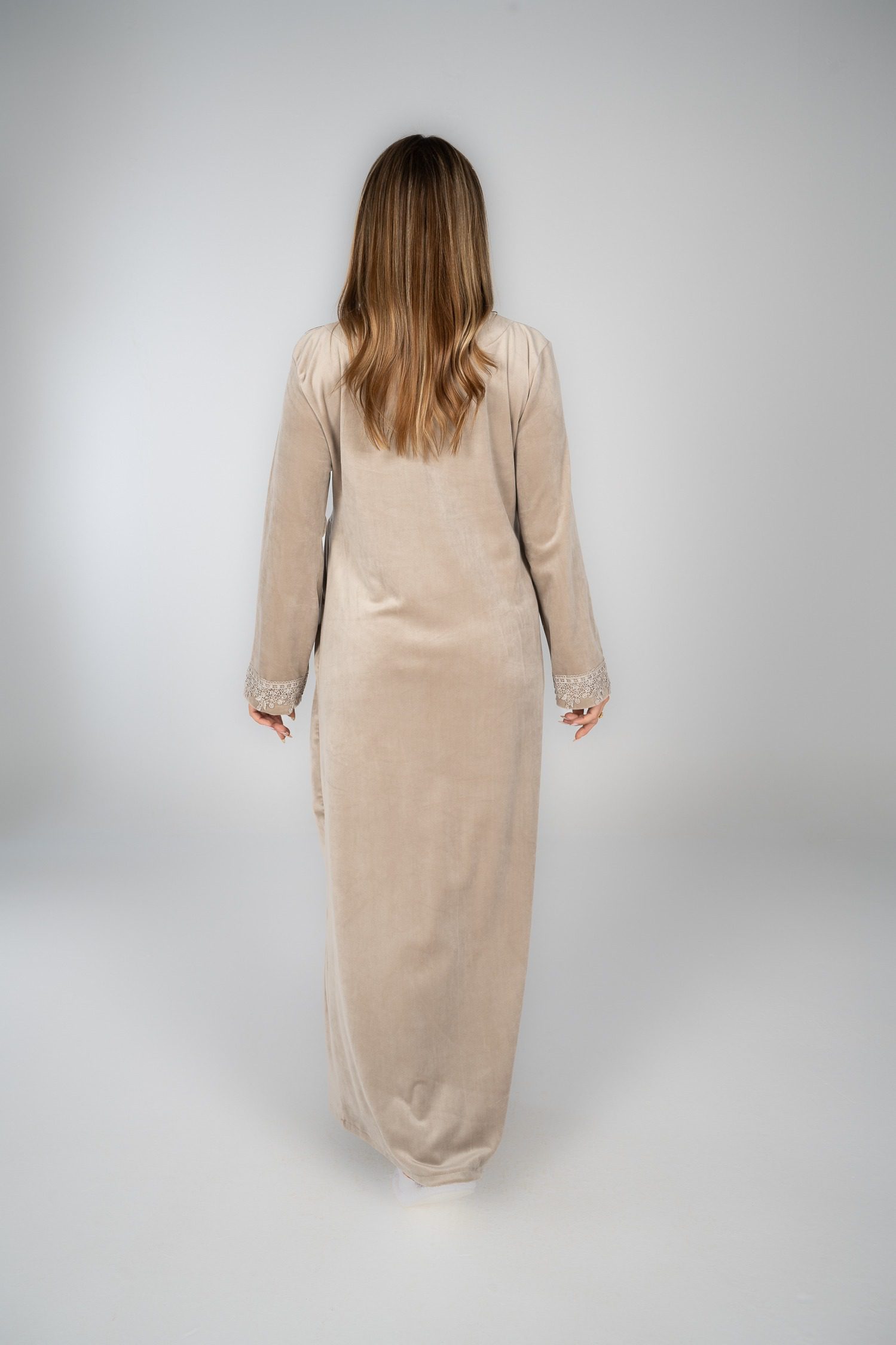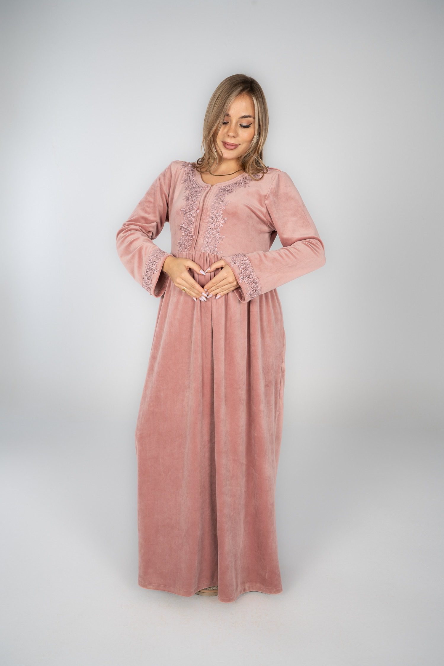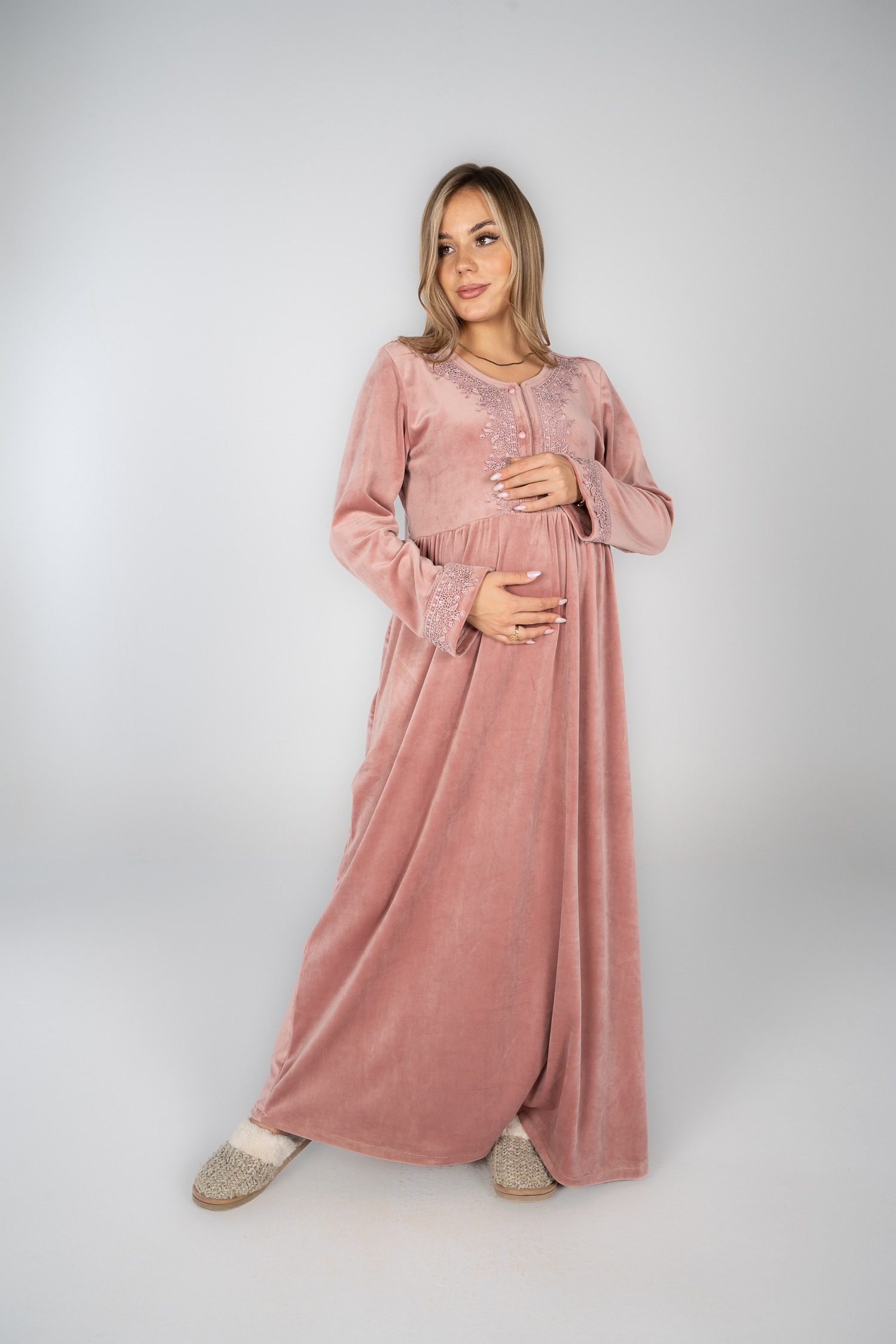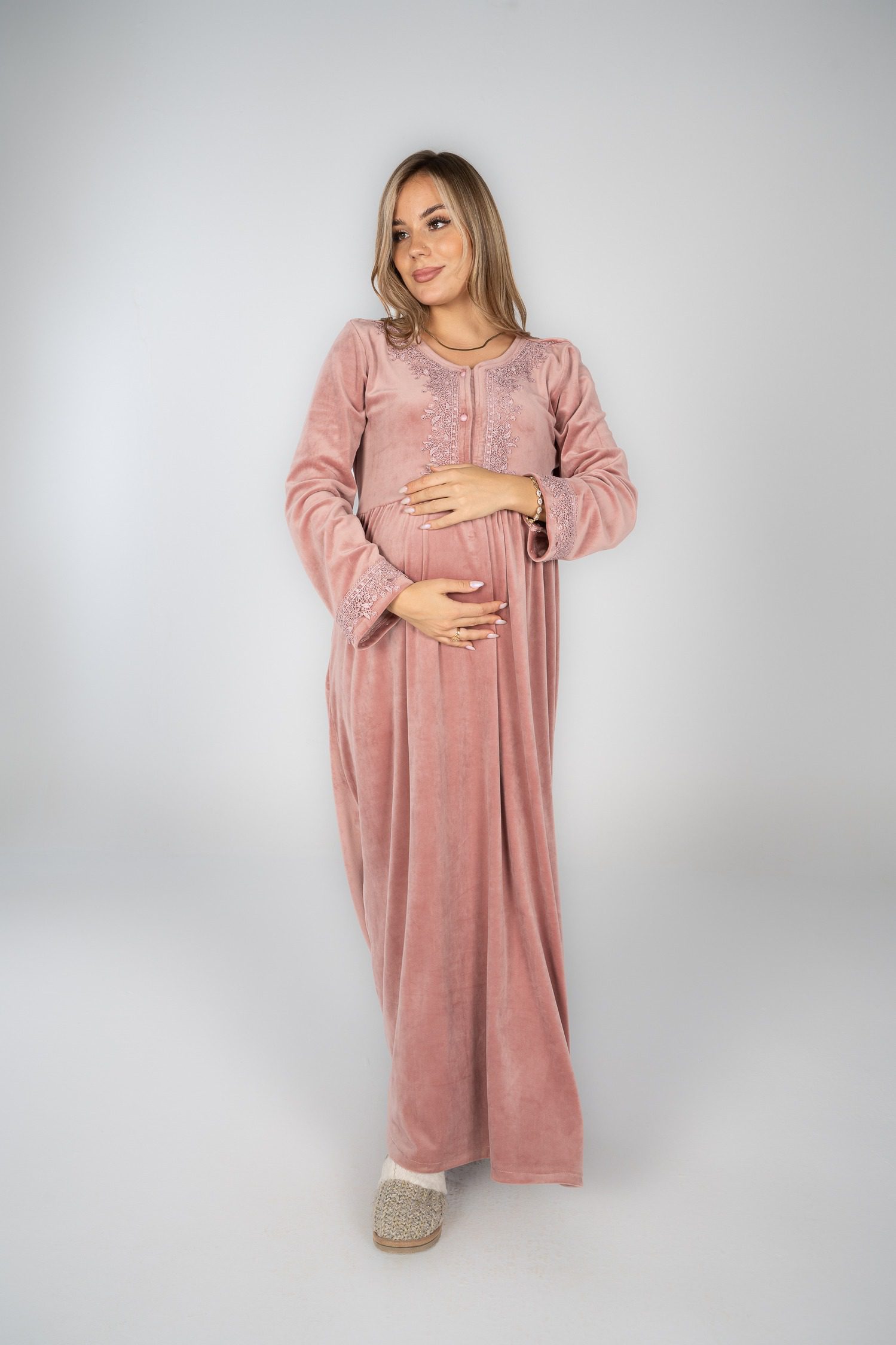 قميص نوم شتوي مخملي مع تفاصيل من الدانتيل لإضفاء لمسة أنيقة.