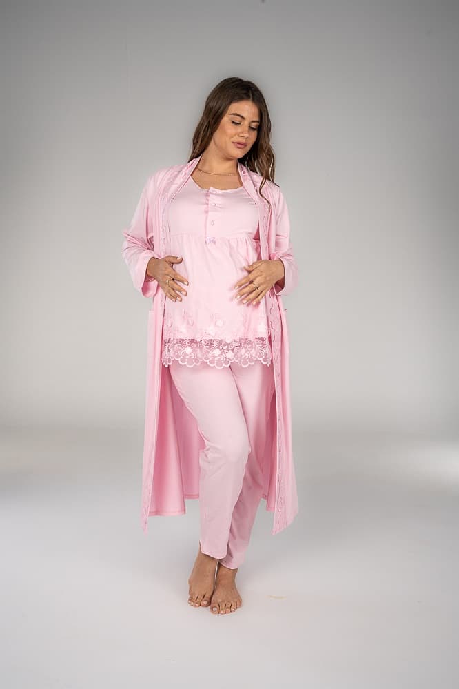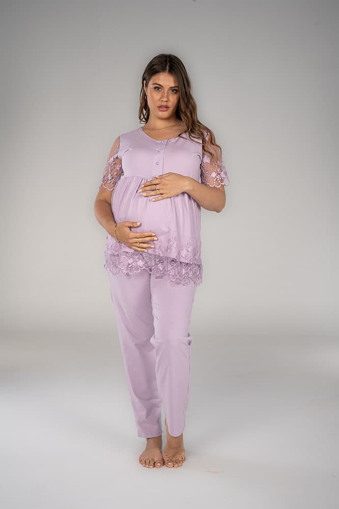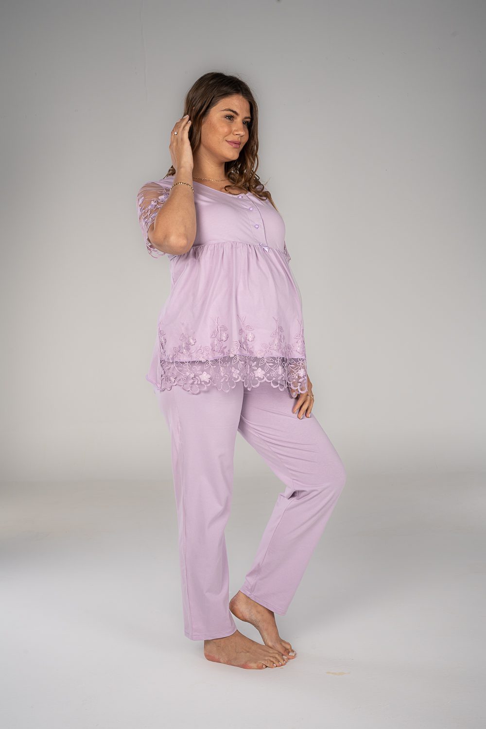 هذا الطقم للحمل مصمم ليمنحك الراحة والأناقة في جميع الأوقات. يتميز بقماشة ناعمة و فتحة صدر بأزرار لسهولة الرضاعة واستك بنطلون قابل للتعديل يعطي مساحة لنمو البطن , مع تفاصيل الدانتيل الرقيق.