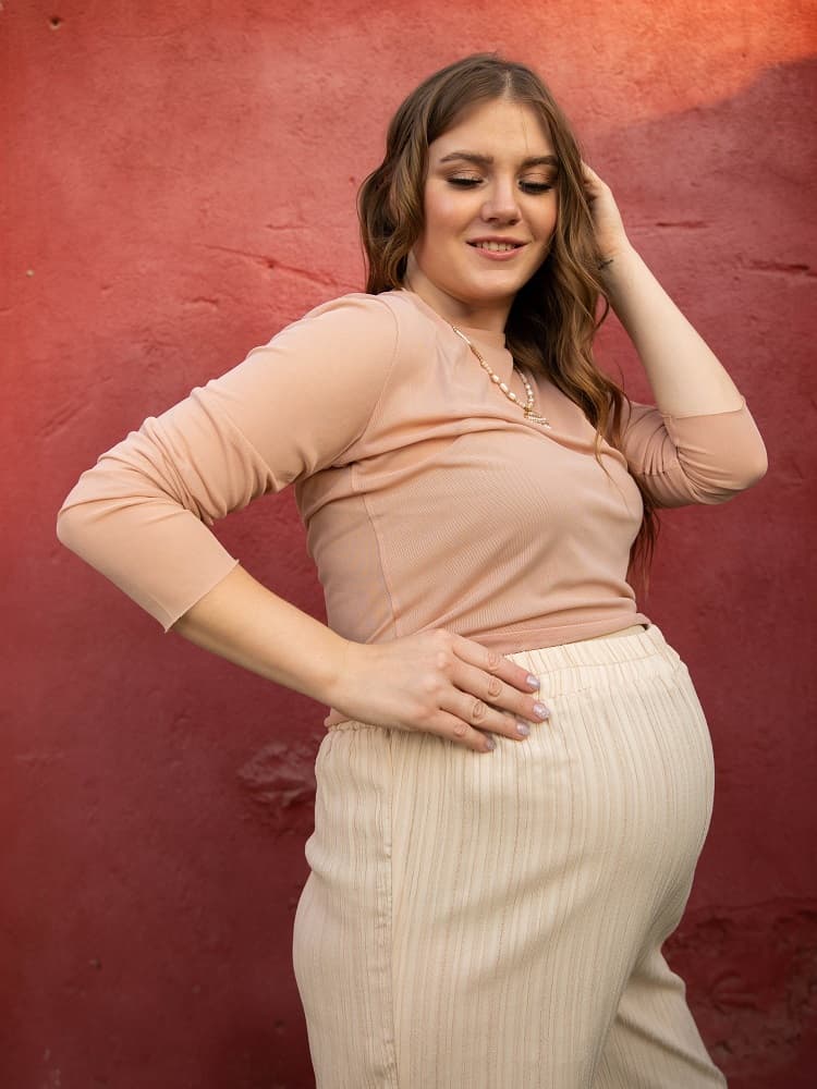 Flowy ribbed beige maternity pants designed to compliment your body during pregnancy and beyond, available in creme beige color, S to XXL.
