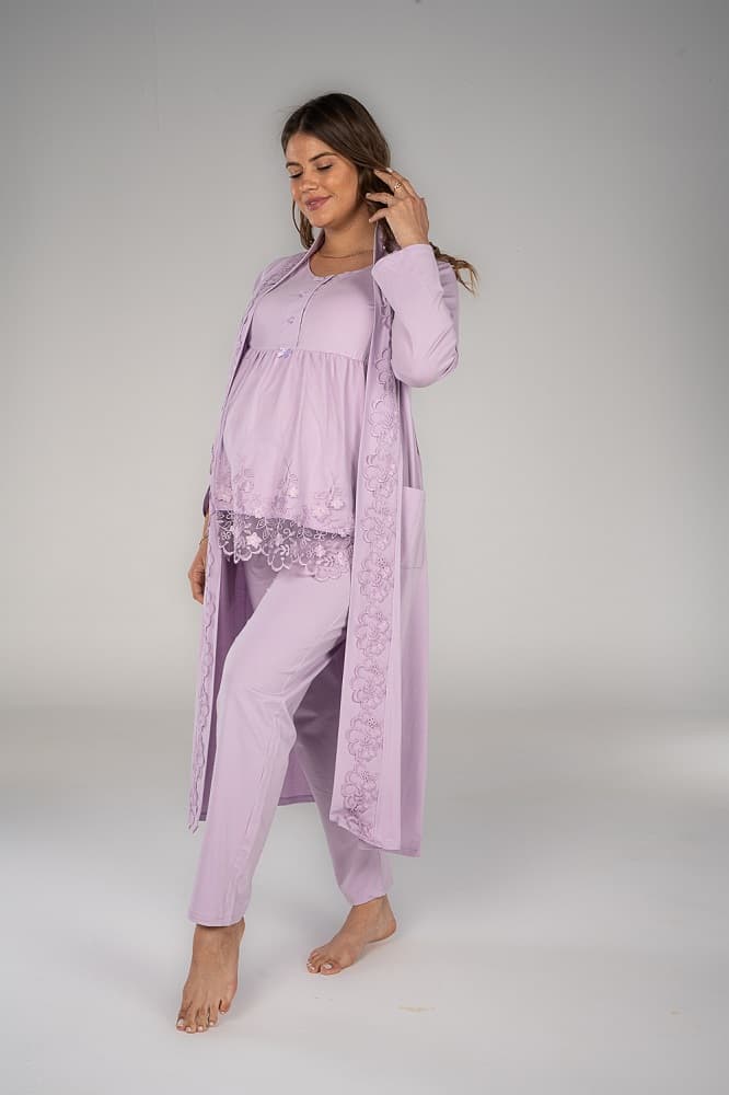 Momtobe’s pajama set for maternity and nursing is your go to set this summer. Set includes: a breathable midi robe, and a comfortable half-sleeve PJ with adjustable waist and beautiful tulle details. Crafted from premium materials, this set offers both comfort and style throughout your pregnancy.