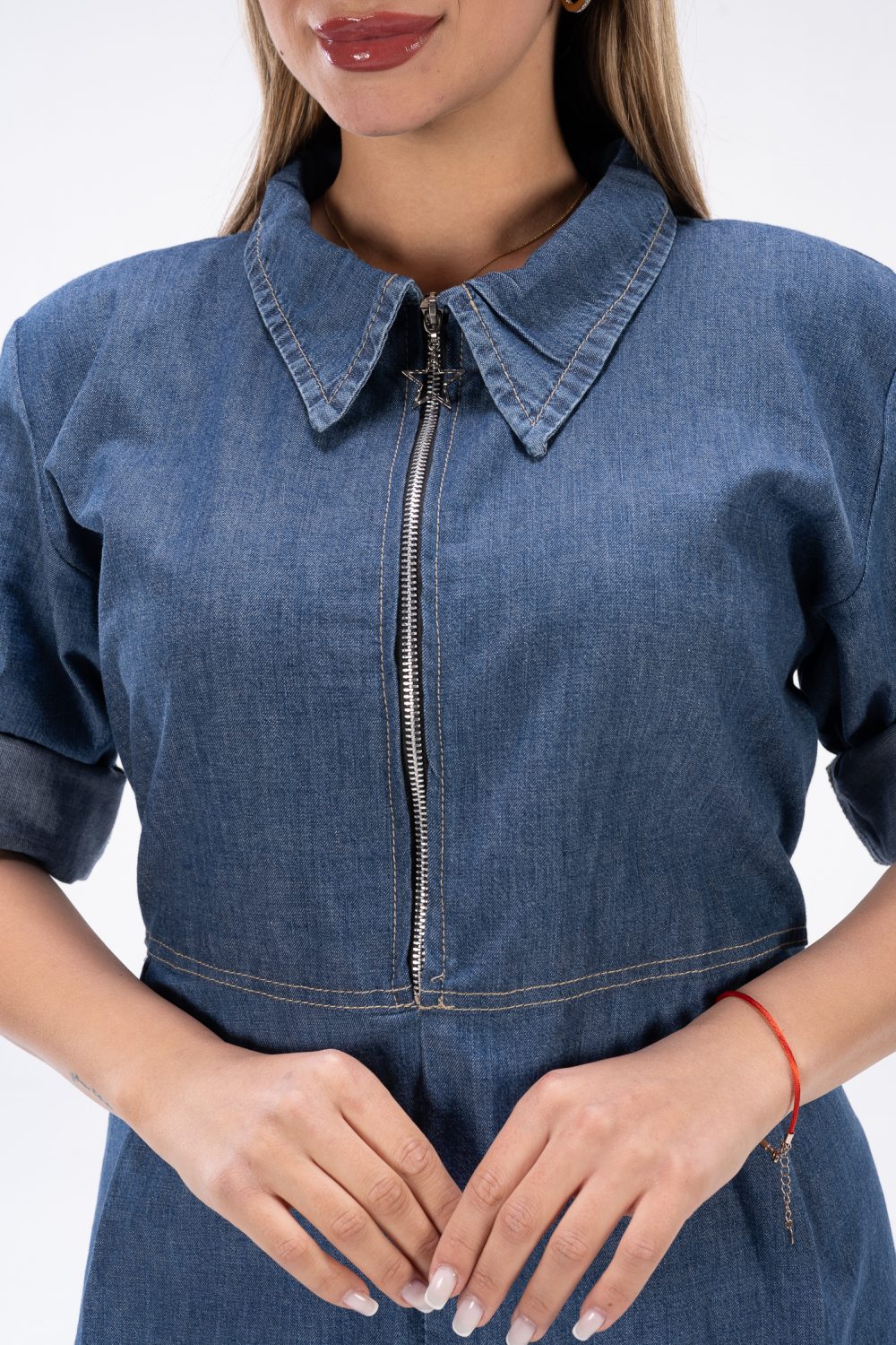 Mid length denim jeans dress with a zipper for a nursing friendly experience.