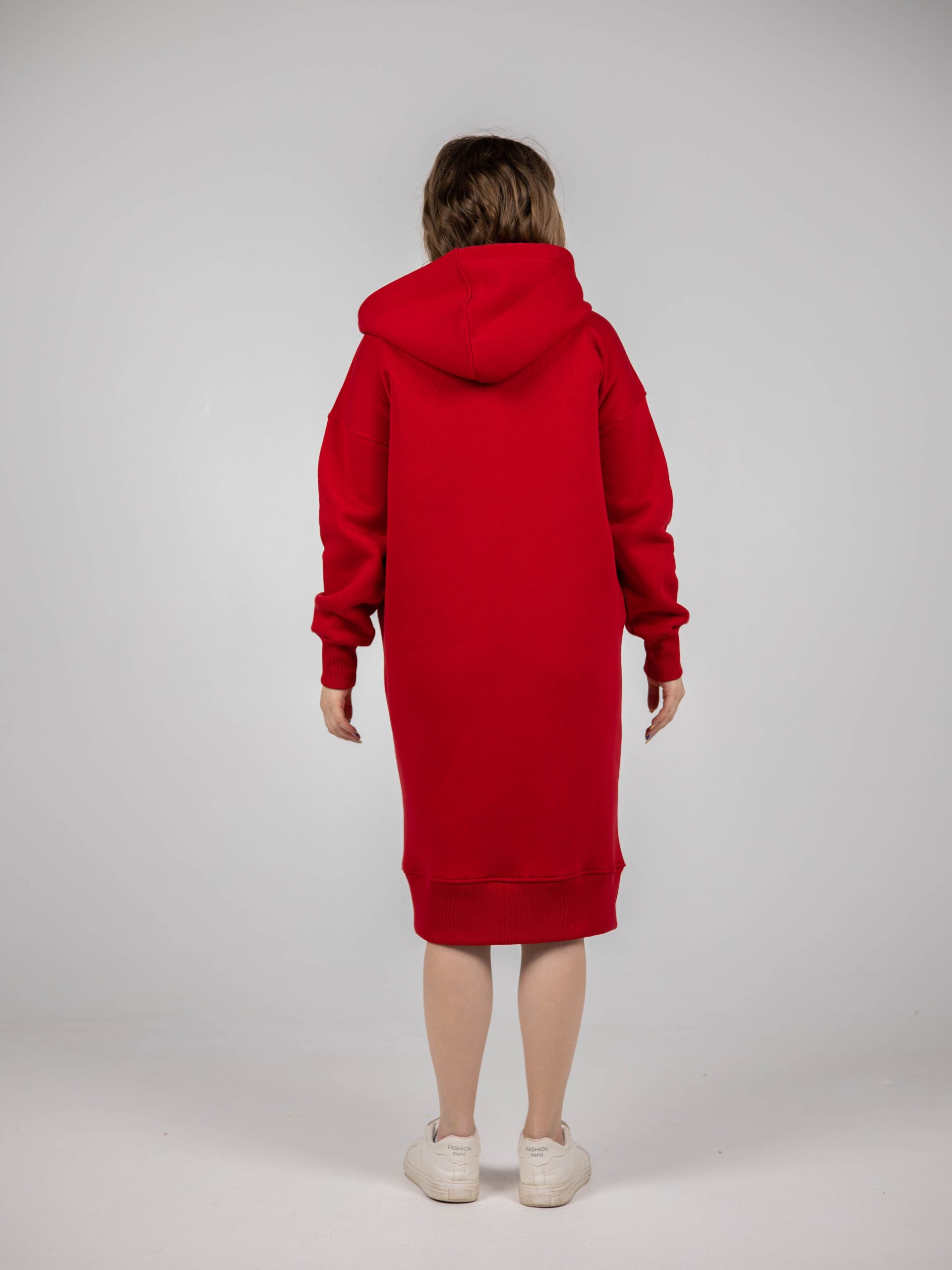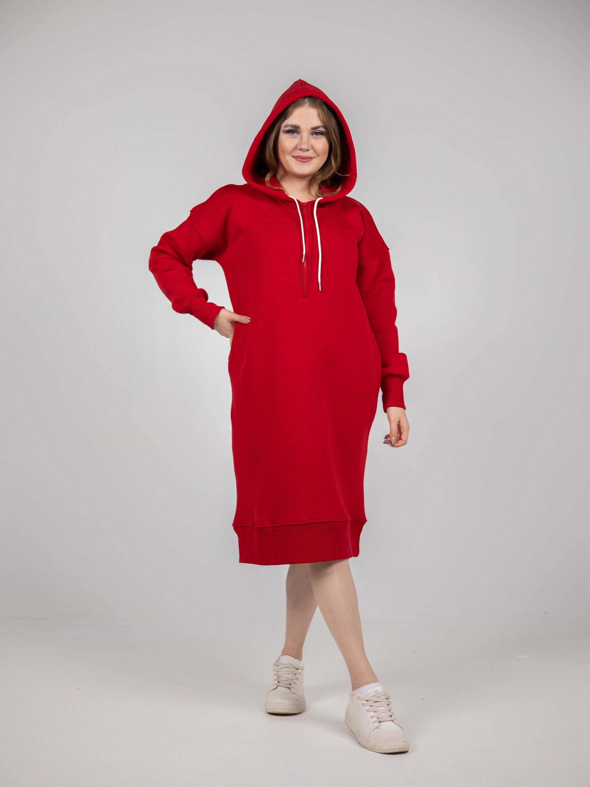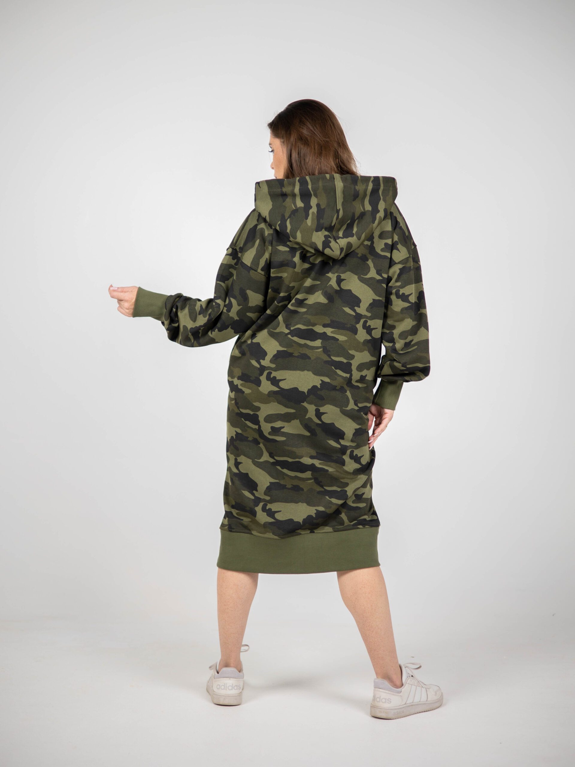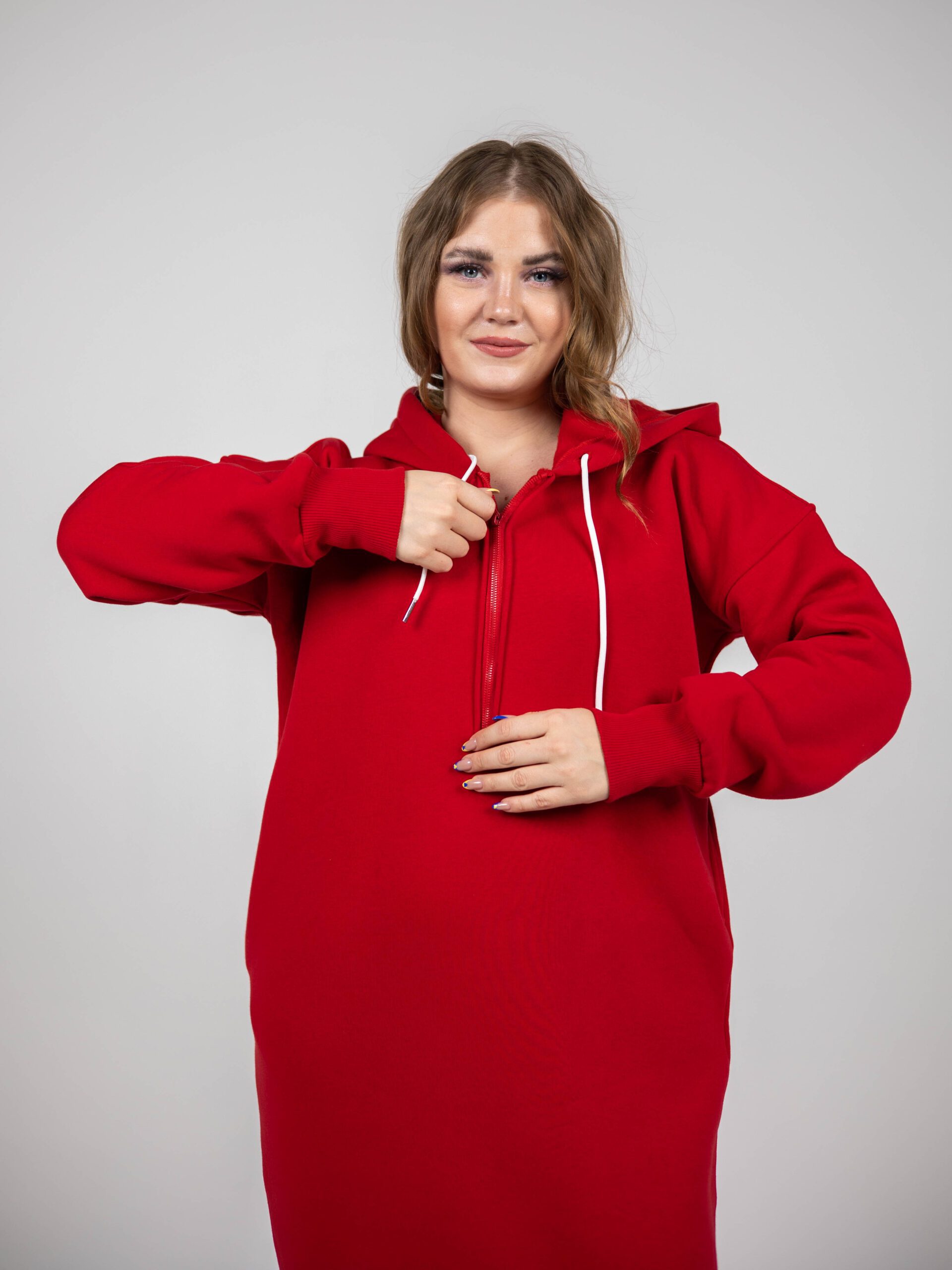 Nursing friendly winter dress with a mid section zipper and hood for style.